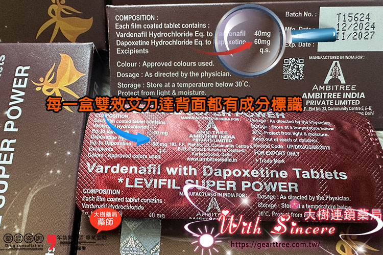由印度 Ambitree 藥廠生產的雙效艾力達,每一粒都結合了兩大有效成分,實現「助勃+持久」的雙重效果: