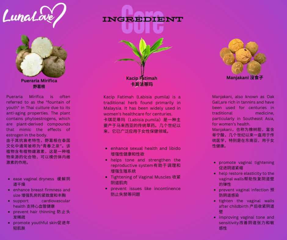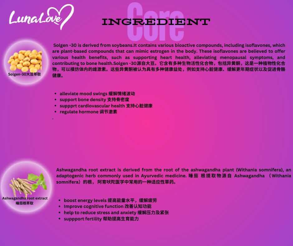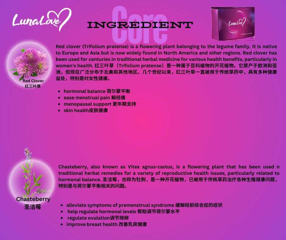Lunalove 女用B糖以女性身心平衡為核心出發點,配方融合多種經科學驗證與傳統應用的天然植萃,達到溫和調理、生理活化與情緒舒緩的協同作用。以下為其關鍵成分組合: