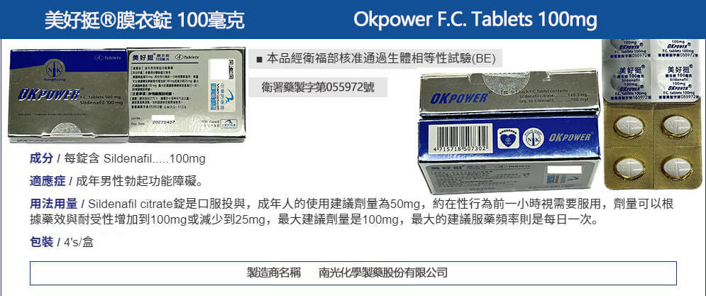 - 每盒含 4 錠 美好挺膜衣錠 OKPOWER,每錠含 100mg Sildenafil