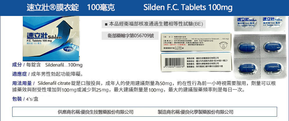 速立壯 Silden 為含有西地那非(Sildenafil)100mg 的口服膜衣錠,用於治療男性勃起功能障礙(ED)。其作用機制為促進陰莖血流,在性刺激下幫助自然勃起。建議於性行為前 30 至 60 分鐘服用,藥效可持續約 4 小時。此產品為處方藥,使用前請諮詢醫師,勿與硝酸酯類藥物併用。
