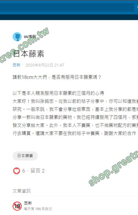 通過以上民眾在服用日本藤素後給出的評價,我們可以看出,日本藤素的藥效是非常強的,日本藤素一經上市,人人哄搶,在日本當地的藥局,藤素也常常出現缺貨需預訂購買的情況!如此強悍的藥效,如此低的副作用!並不是廠家胡亂編造的噱頭!好的壯陽藥是經得起打磨,經得起錘煉的!!歡迎各位顧客到大樹藥局購買正品日本藤素。