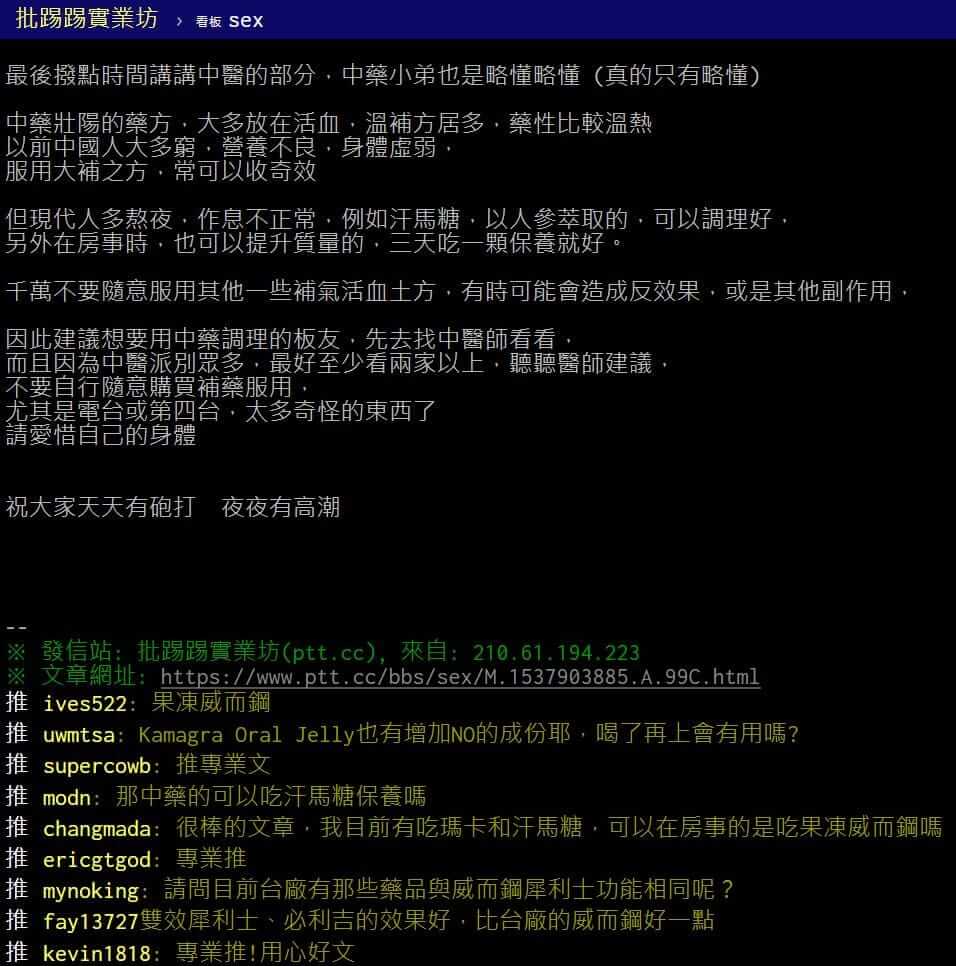 - 在 PTT 上,許多使用者分享了自己服用泰國果凍威而鋼的經驗。大多數人表示,這款藥物能夠有效改善勃起功能,幫助他們恢復性生活的自信。一些用戶稱,它的效果與威而鋼(Viagra)相似,但價格更為實惠。
